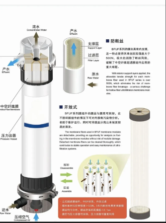 نوع الضغط الداخلي: يتدفق الماء الخام من داخل الغشاء إلى الخارج، وهو مناسب لجودة المياه العالية العكارة
